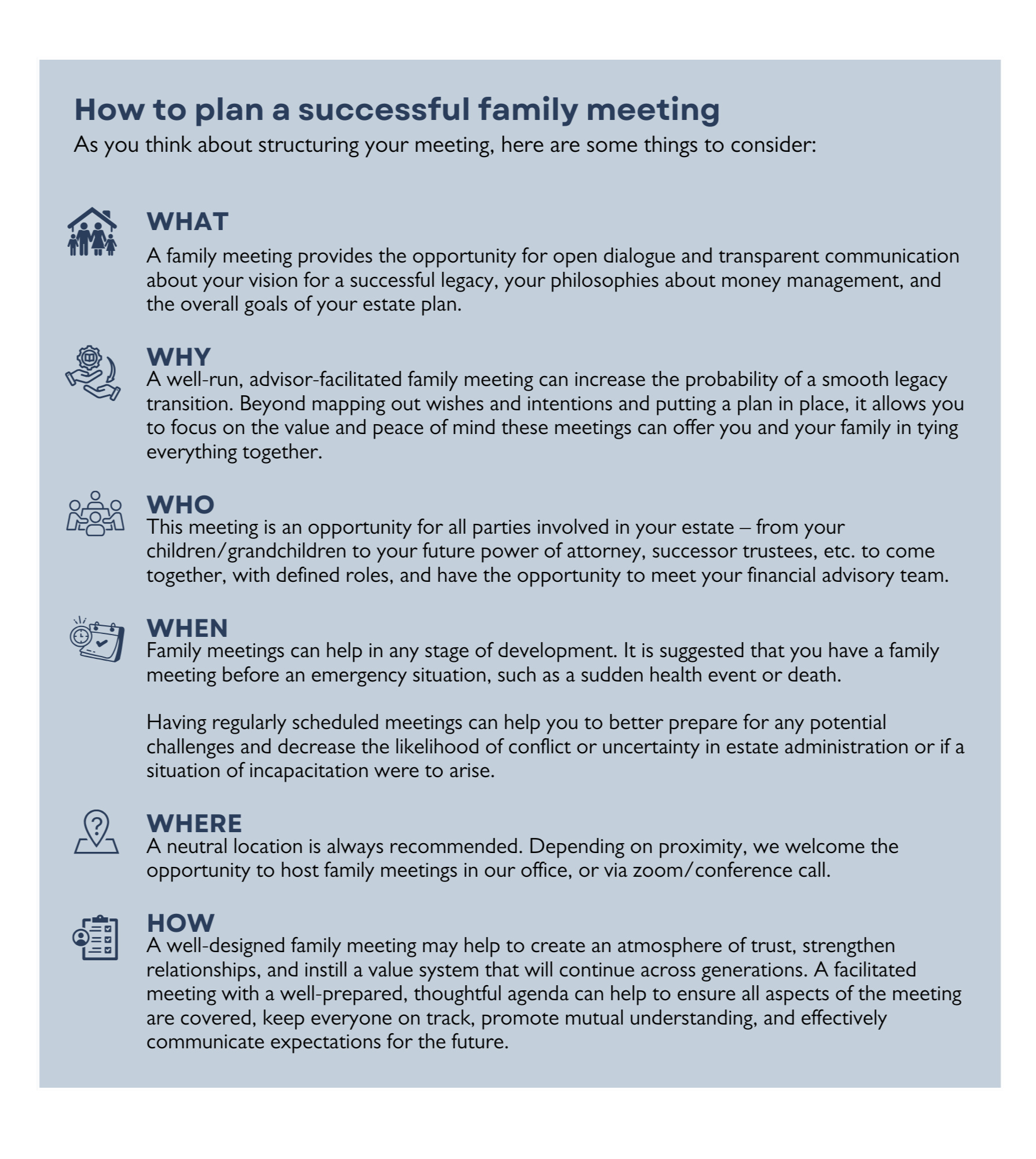 At Richards & Cady Wealth Advisors, we have over 40 years of multi-generational wealth advisory experience. Our clients and their families have found value in facilitated family meetings and the opportunity for those individuals involved to meet with our financial advisory and service team to ask questions and gain a better awareness of the work we have done together.